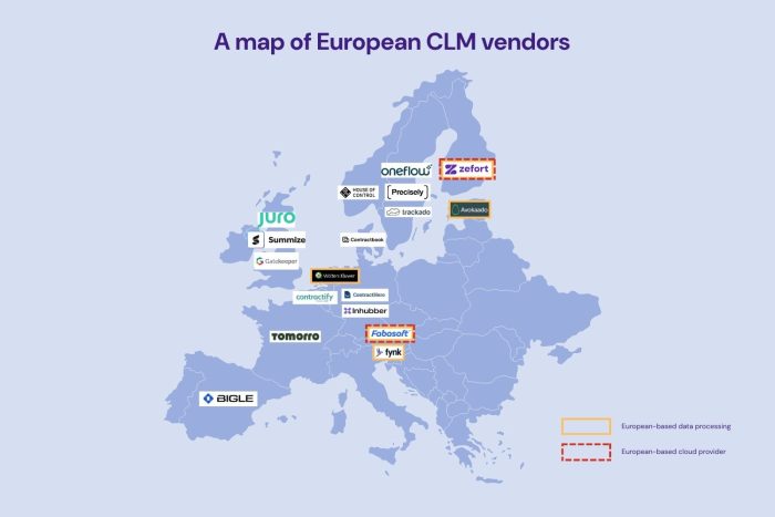 Following clarification from fynk, this article has been updated to reflect that the vendor processes core service data within the EU region. As a result, fynk has been added to the map of CLM providers with European data processing.